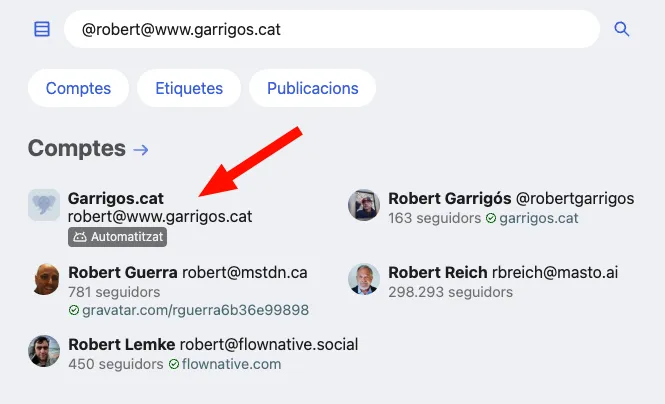 El compte federat del meu web a garrigos.cat es visualitza en un compte de mastodon.