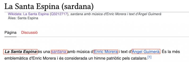 Aquí dalt veieu part de la pàgina de La Santa Espina a Viquipèdia. Com podeu apreciar, al primer paràgraf hi podem llegir algunes dades molt importants de l'article, el títol (La Santa Espina), de què estem parlant (sardana), el seu compositor (Enric Morera) i el seu lletrista (Àngel Guimerà). Que Morera n'és el compositor ho sabem perquè el text diu amb música de, però de fet no veiem la paraula compositor enlloc. Això ho podem fer perquè som persones amb un coneixement adquirit que ens permet fer aquest tipus de connexions conceptuals. Però a un ordinador li hem de posar les coses més fàcils.
