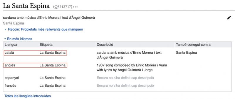 El primer que trobem a l'entrada de la Santa Espina a Wikidata és que el títol, que a la Viquipèdia és únic, es pot traduir a diversos idiomes. En aquest cas és el mateix, però quan parlem d'altres conceptes la traducció és important.