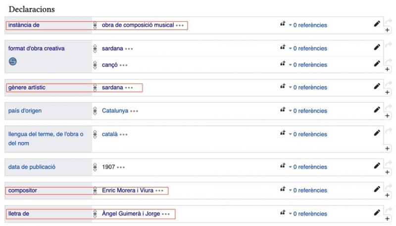 Aquí dalt veiem com s'estructuren a Wikidata aquelles mateixes dades que hem trobat redactades a Viquipèdia. El què el trobem separat en dos conceptes: instància (obra de composició musical) i el gènere artístic (sardana). El compositor i el lletrista els trobem degudament etiquetats. És a dir, cada valor d'una dada té assignada una propietat: Enric Morera és el valor de la propietat compositor, Àngel Guimerà és el valor de la propietat lletra de i sardana és el valor de gènere artístic. A la pàgina que conté totes les dades d'un element, en aquest cas la sardana La Santa Espina, li diem element.